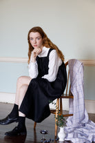The Rita pinafore style dress is relaxed fit pinafore style dress with pockets. Featuring covered buttons, the dress can be worn with buttons to the back or front. A perfect dress all year round, wear with layers during colder months.